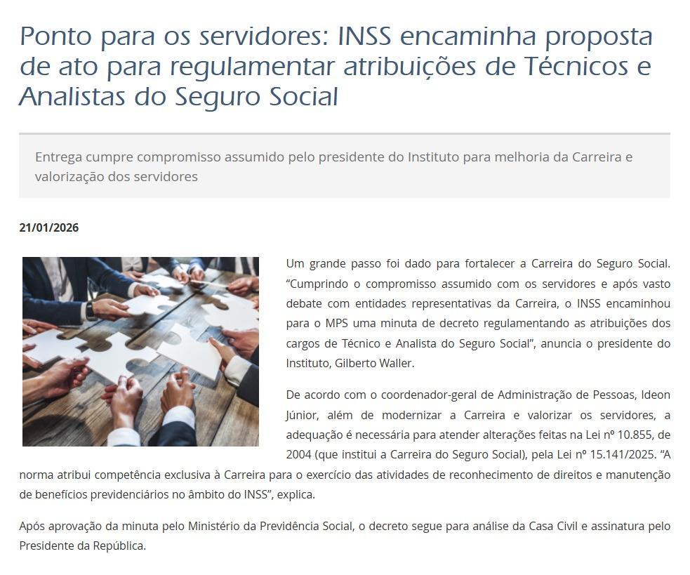 O Instituto Nacional do Seguro Social (INSS) publicou a minuta de decreto que detalha as atribuições dos cargos de Analista do Seguro Social e Técnico do Seguro Social, conforme previsto na Lei nº 10.855, de 1º de abril de 2004. A iniciativa marca um passo decisivo no fortalecimento da Carreira do Seguro Social, tema que vem sendo debatido há anos pelas entidades representativas dos servidores.